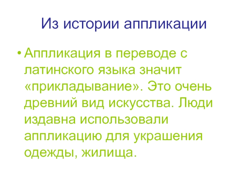 Из истории аппликацииАппликация в переводе с латинского языка значит «прикладывание». Это очень древний вид искусства. Люди издавна использовали аппликацию для украшения одежды, жилища.