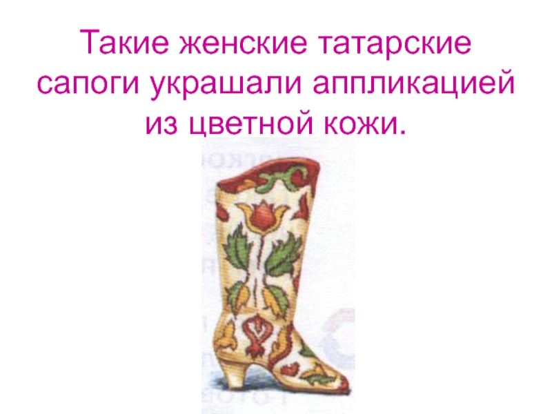 Слайд 5Такие женские татарские сапоги украшали аппликацией из цветной кожи.