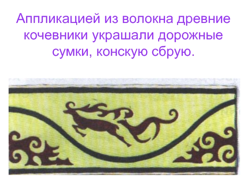 Слайд 3Аппликацией из волокна древние кочевники украшали дорожные сумки, конскую сбрую.
