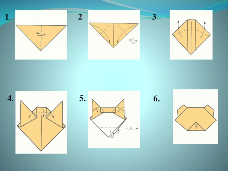 1.Возьмите карий квадрат 10х10. Сложите базисную форму Треугольник. Перегните треугольник напополам.   2.3.4.5.6.