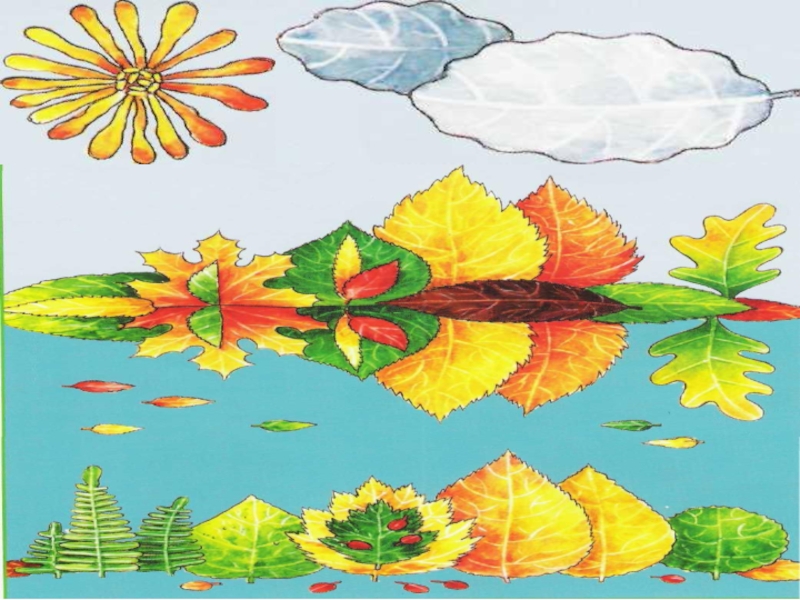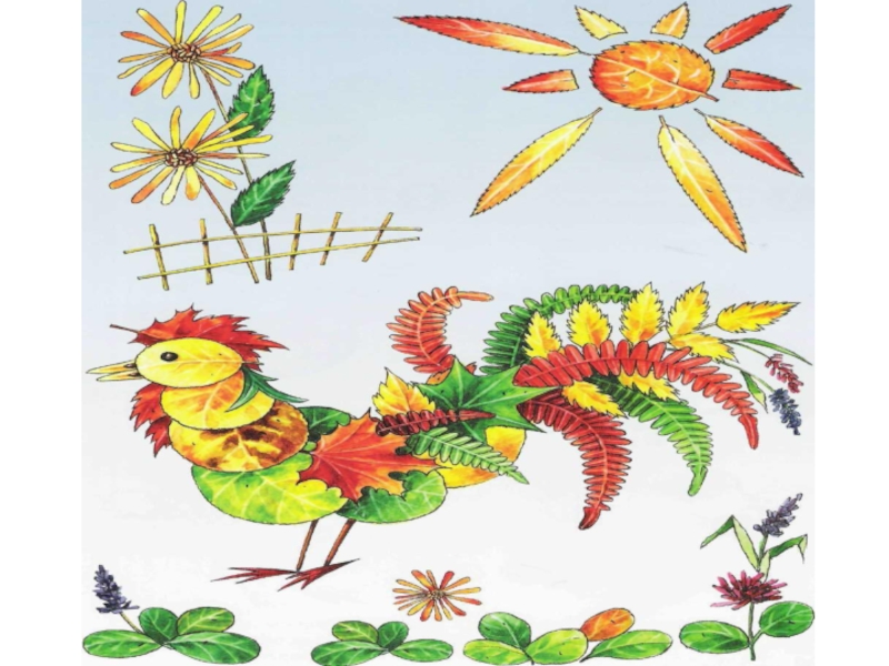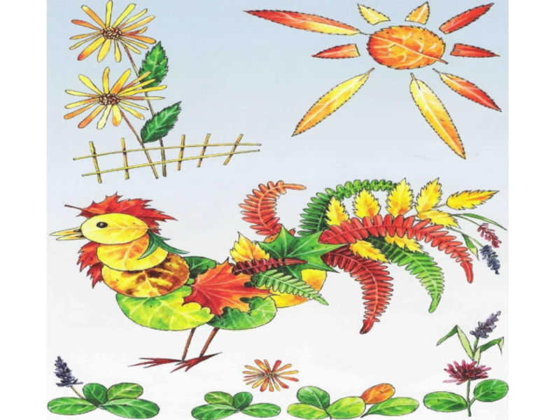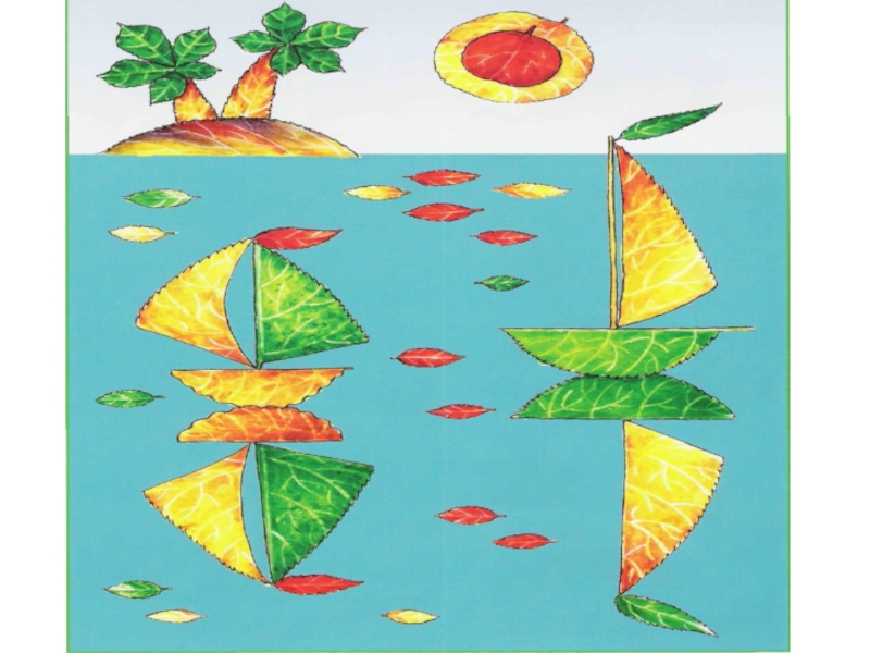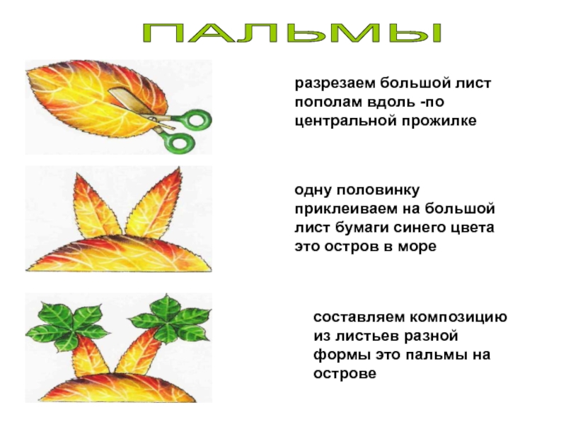 составляем композицию из листьев разной формы это пальмы на острове