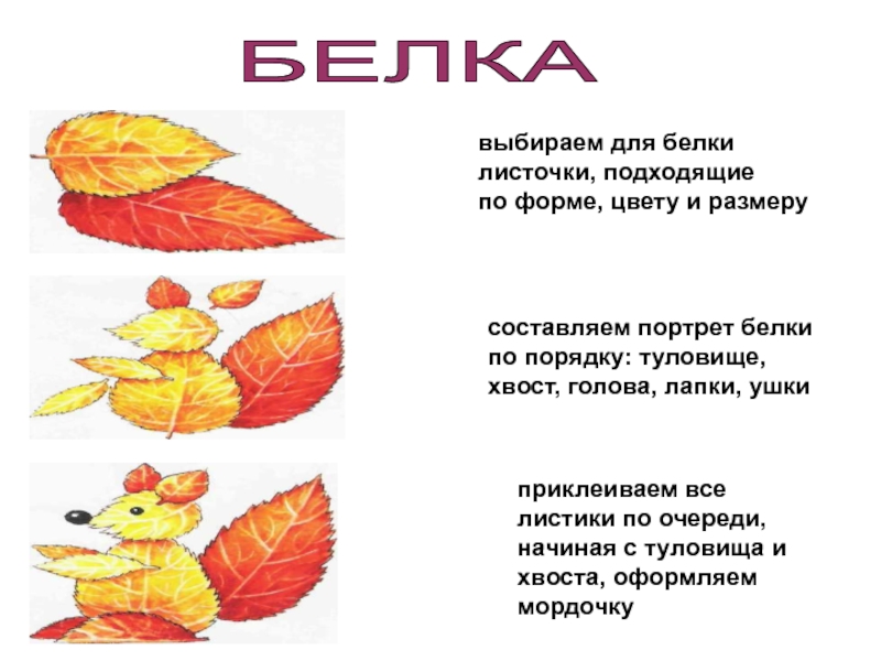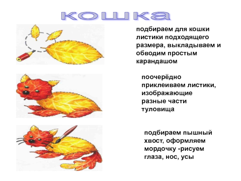 приклеиваем все листики по очереди, начиная с туловища и хвоста, оформляем мордочку