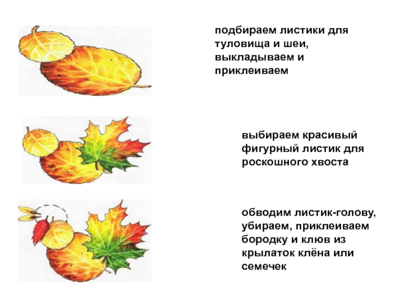обводим листик-голову, убираем, приклеиваем бородку и клюв из крылаток клёна или семечек