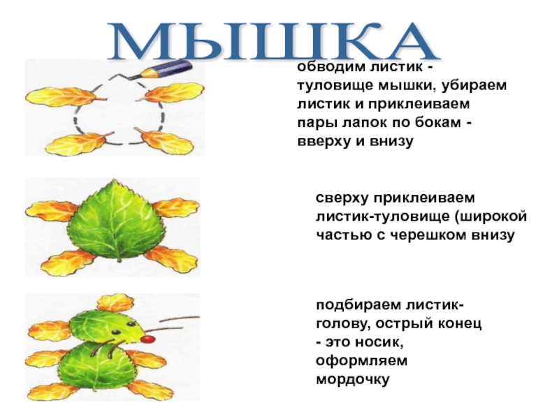 подбираем листик-голову, острый конец - это носик, оформляем мордочку