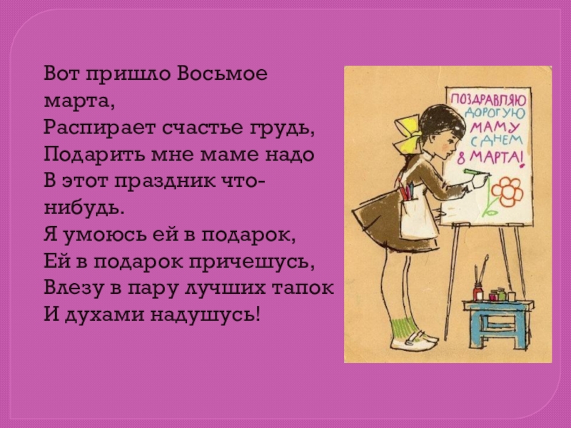 Вот пришло Восьмое марта,  Распирает счастье грудь,  Подарить мне маме надо  В этот праздник что-нибудь.  Я умоюсь ей в подарок,  Ей в подарок причешусь,  Влезу в пару лучших тапок  И духами надушусь!