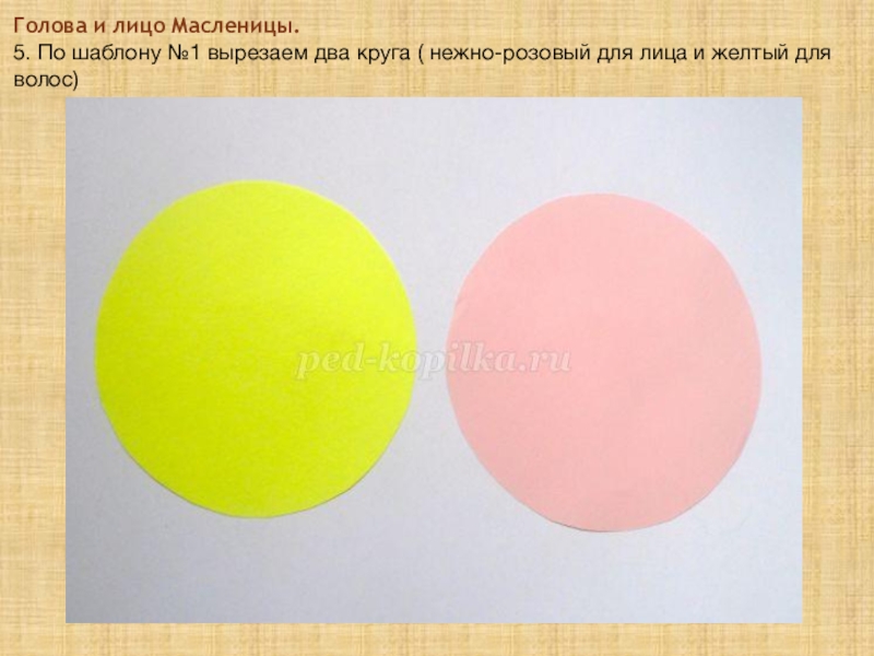 Голова и лицо Масленицы.5. По шаблону №1 вырезаем два круга ( нежно-розовый для лица и желтый для