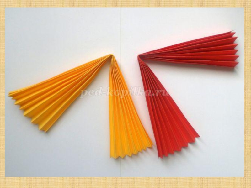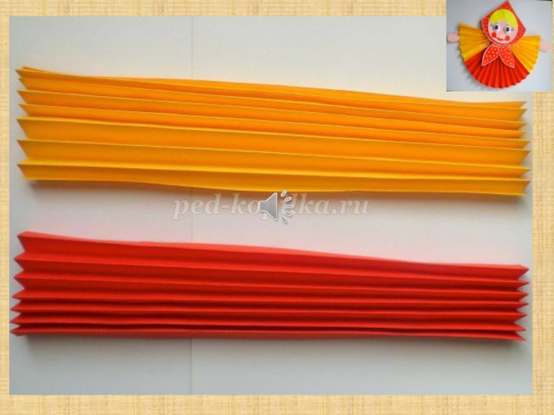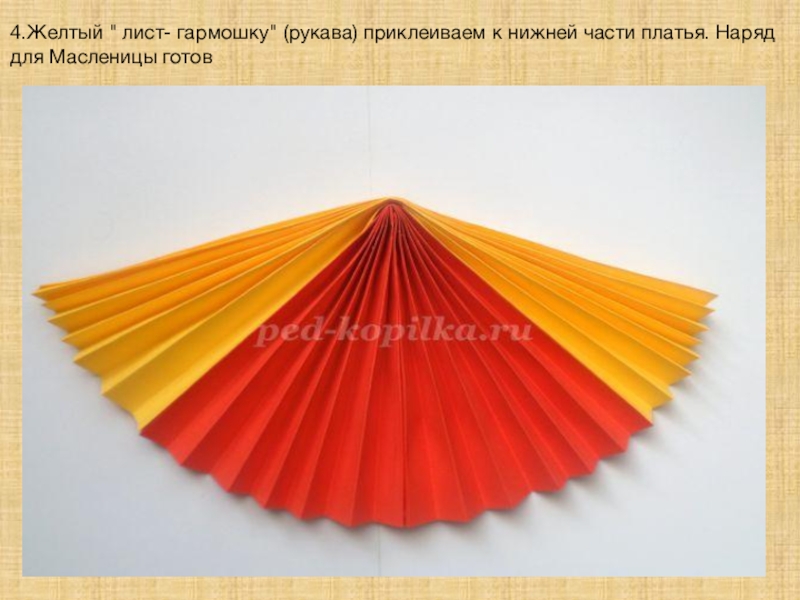 Слайд 84.Желтый " лист- гармошку" (рукава) приклеиваем к нижней части платья. Наряд