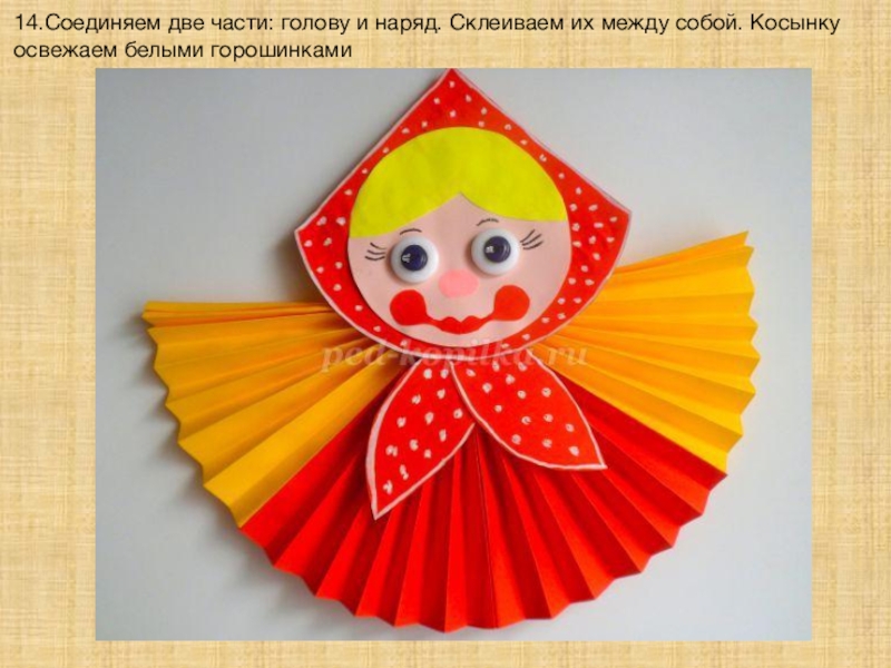 Слайд 1714.Соединяем две части: голову и наряд. Склеиваем их между собой. Косынку