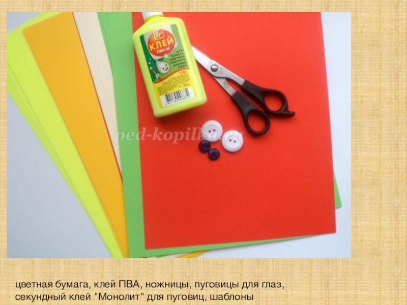 Слайд 3цветная бумага, клей ПВА, ножницы, пуговицы для глаз, секундный клей "Монолит"