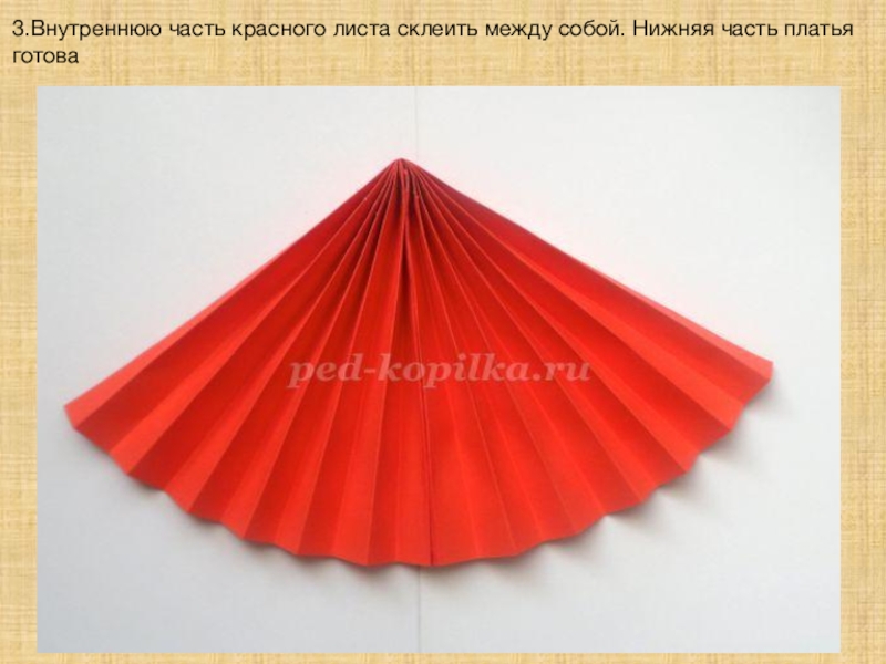 Слайд 73.Внутреннюю часть красного листа склеить между собой. Нижняя часть платья готова