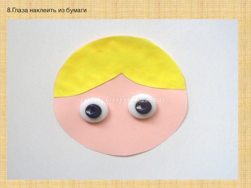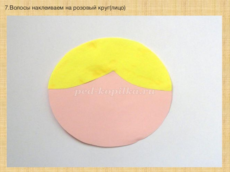 Слайд 117.Волосы наклеиваем на розовый круг(лицо)