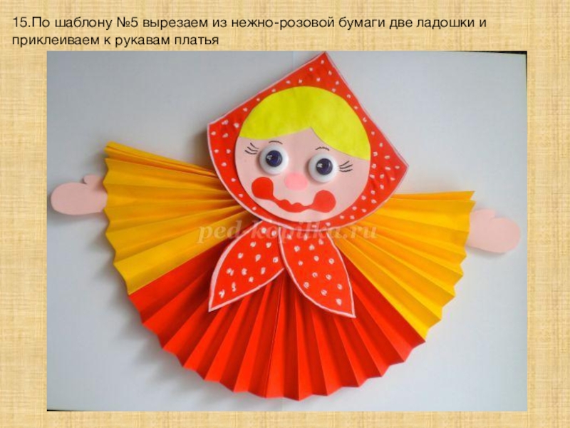 15.По шаблону №5 вырезаем из нежно-розовой бумаги две ладошки и приклеиваем к рукавам платья