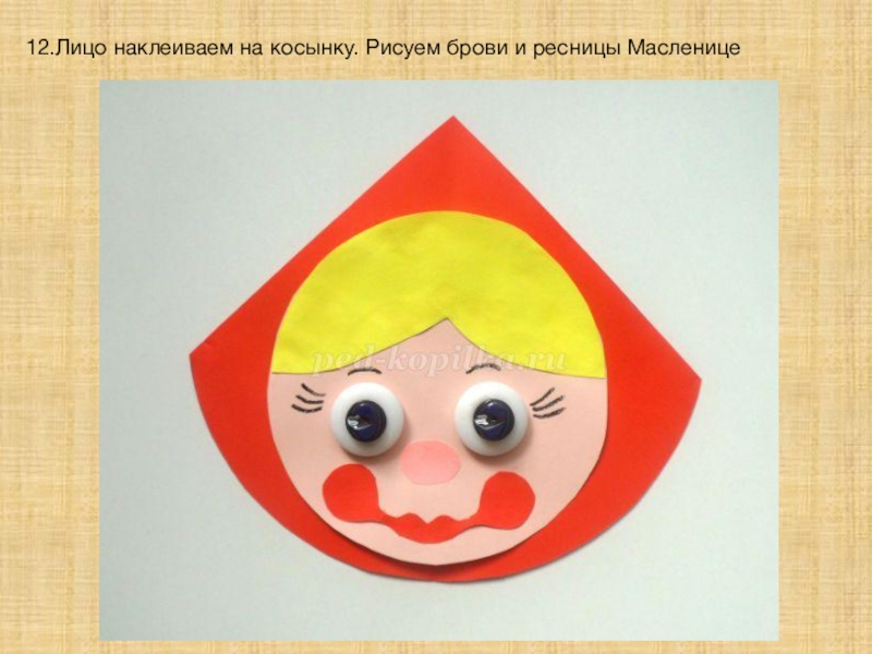Слайд 15 12.Лицо наклеиваем на косынку. Рисуем брови и ресницы Масленице