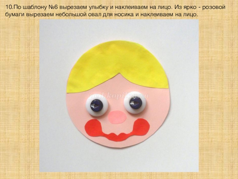 10.По шаблону №6 вырезаем улыбку и наклеиваем на лицо. Из ярко - розовой бумаги вырезаем небольшой овал