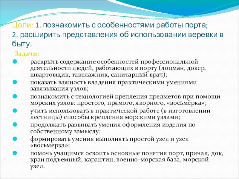 помочь учащимся освоить основные понятия порт, причал, док, кран подъемный, карантин, военно-морская база, морской узел.