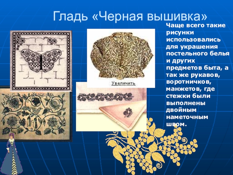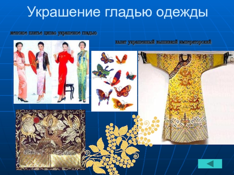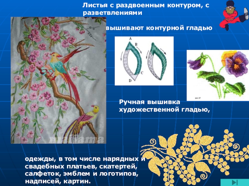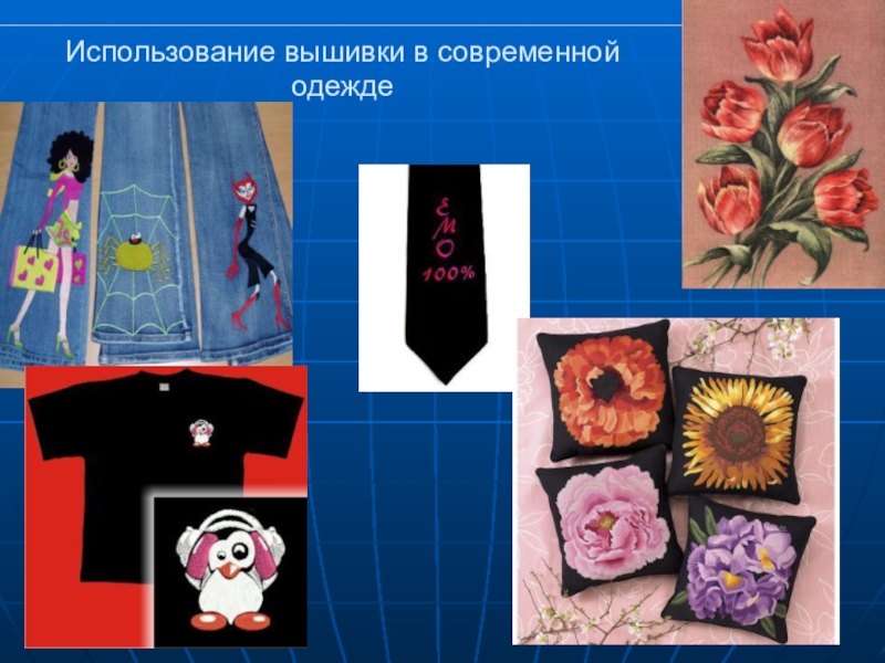 одежды, в том числе нарядных и свадебных платьев, скатертей, салфеток, эмблем и логотипов, надписей, картин.