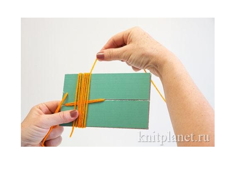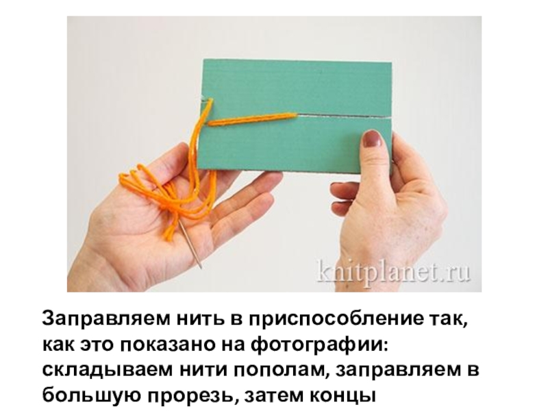 Слайд 14Заправляем нить в приспособление так, как это показано на фотографии: складываем