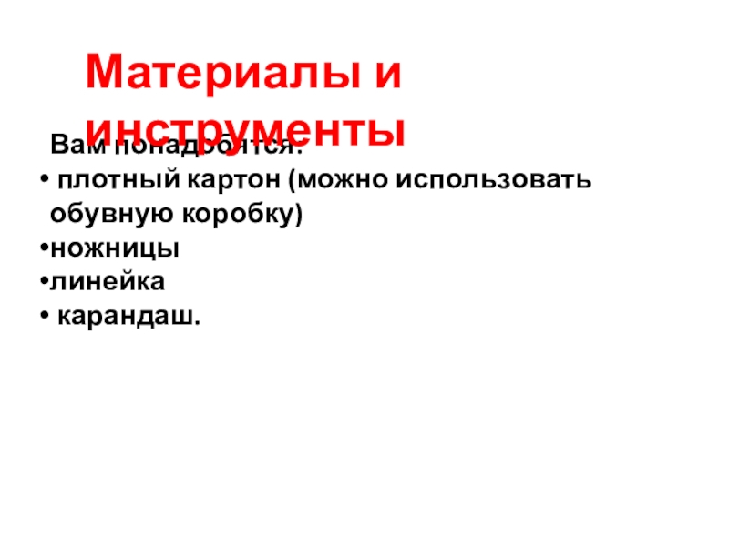 Вам понадобятся: плотный картон (можно использовать обувную коробку) ножницылинейка карандаш.Материалы и инструменты