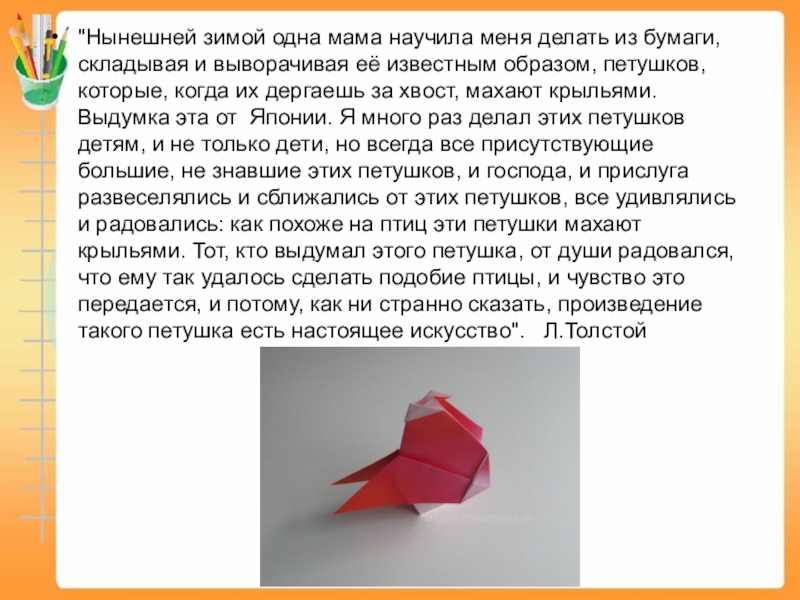 выворачивая её известным образом, петушков, которые, когда их дергаешь за хвост, махают крыльями. Выдумка эта от Японии. Я много раз делал этих петушков детям, и не только дети, но всегда все присутствующие большие, не знавшие этих петушков, и господа, и прислуга развеселялись и сближались от этих петушков, все удивлялись и радовались: как похоже на птиц эти петушки махают крыльями. Тот, кто выдумал этого петушка, от души радовался, что ему так удалось сделать подобие птицы, и чувство это передается, и потому, как ни странно сказать, произведение такого петушка есть настоящее искусство". Л.Толстой