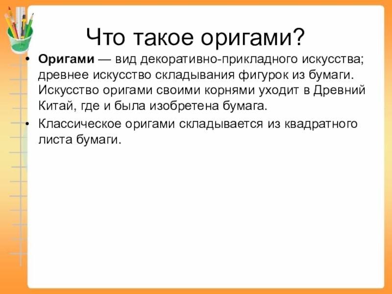 Что такое оригами?Оригами — вид декоративно-прикладного искусства; древнее искусство складывания фигурок из бумаги. Искусство оригами своими корнями уходит в Древний Китай, где и была изобретена бумага. Классическое оригами складывается из квадратного листа бумаги.