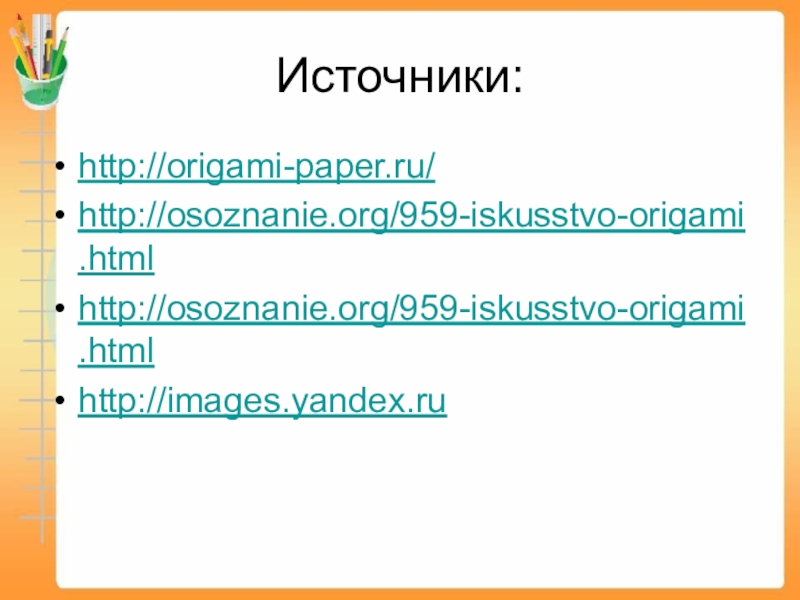 Источники:http://origami-paper.ru/http://osoznanie.org/959-iskusstvo-origami.htmlhttp://osoznanie.org/959-iskusstvo-origami.htmlhttp://images.yandex.ru