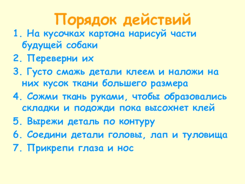 Порядок действий1. На кусочках картона нарисуй части будущей собаки2. Переверни их3. Густо смажь детали клеем и наложи