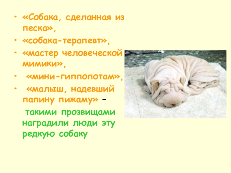 «Собака, сделанная из песка», «собака-терапевт», «мастер человеческой мимики», «мини-гиппопотам», «малыш, надевший папину пижаму» – 	такими прозвищами наградили