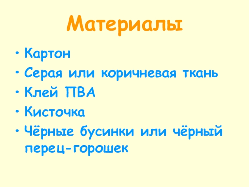 МатериалыКартонСерая или коричневая тканьКлей ПВАКисточкаЧёрные бусинки или чёрный перец-горошек