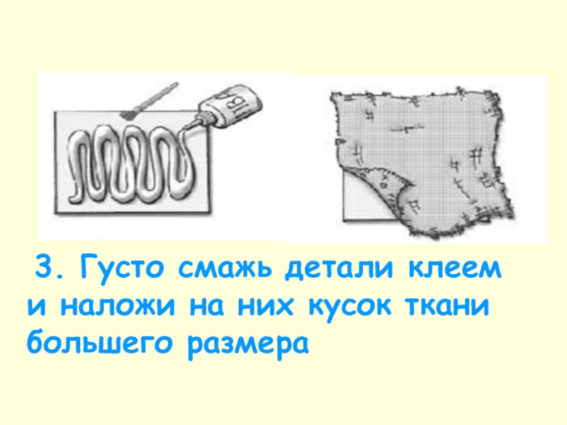 Слайд 10 3. Густо смажь детали клеем и наложи на них кусок ткани