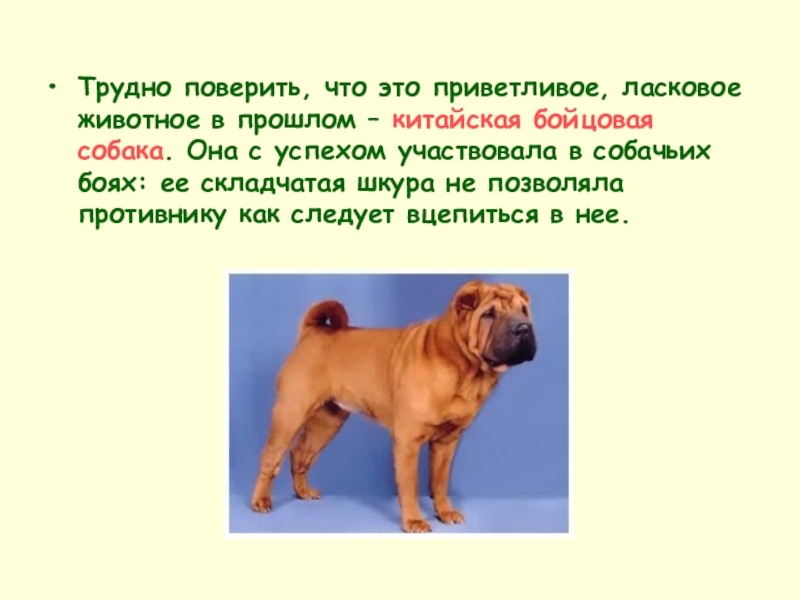 бойцовая собака. Она с успехом участвовала в собачьих боях: ее складчатая шкура не позволяла противнику как следует вцепиться в нее.