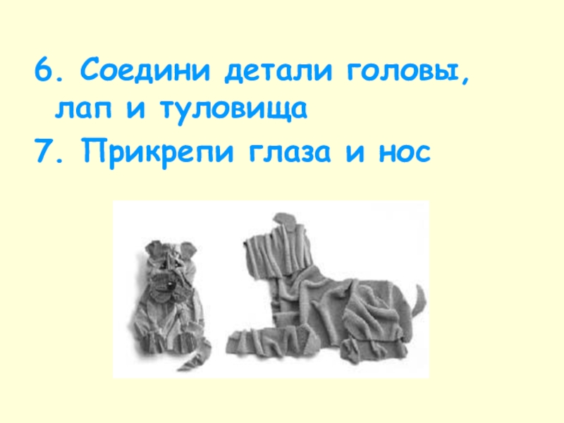 6. Соедини детали головы, лап и туловища7. Прикрепи глаза и нос