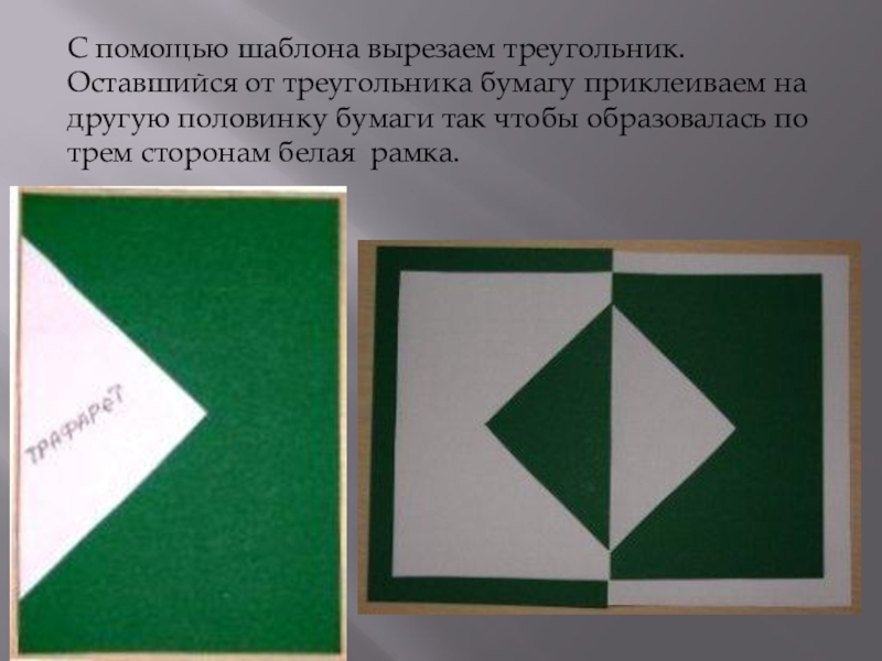 треугольника бумагу приклеиваем на другую половинку бумаги так чтобы образовалась по трем сторонам белая рамка.