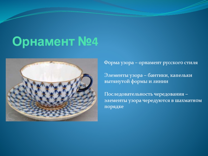 Орнамент №4Форма узора – орнамент русского стиляЭлементы узора – бантики, капельки вытянутой формы и линииПоследовательность чередования –элементы