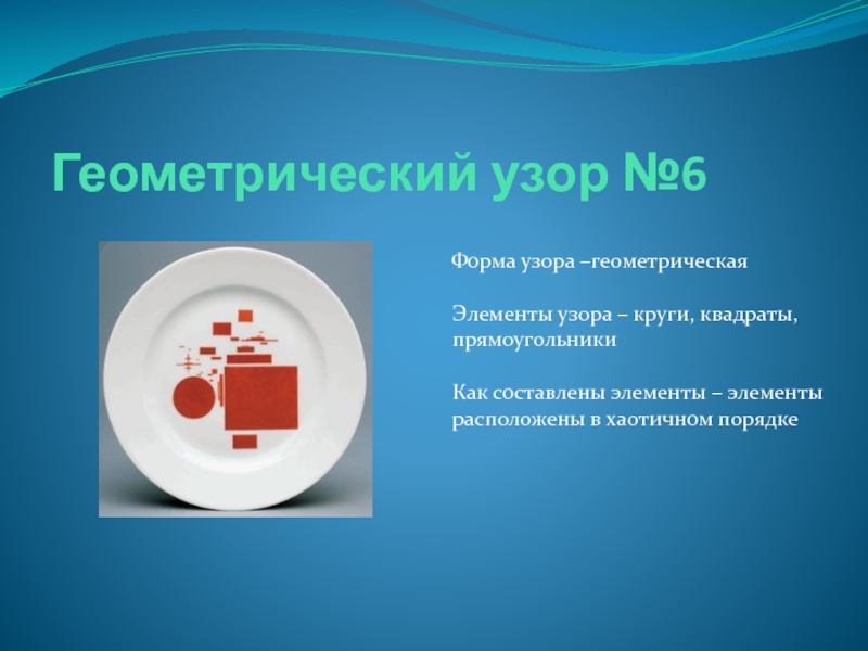 Геометрический узор №6Форма узора –геометрическаяЭлементы узора – круги, квадраты, прямоугольникиКак составлены элементы – элементы расположены в хаотичном
