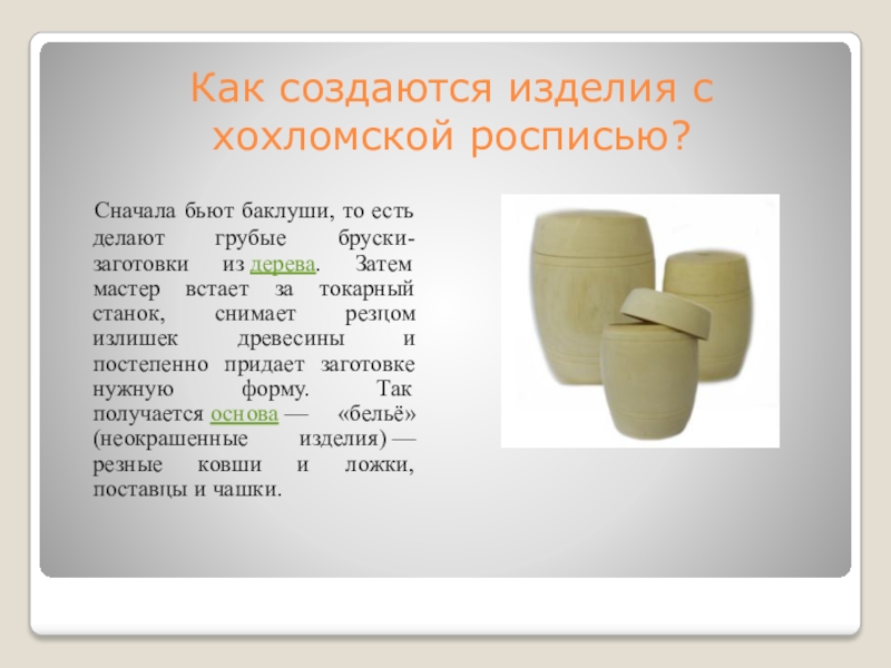 Как создаются изделия с хохломской росписью? Сначала бьют баклуши, то есть делают грубые бруски-заготовки из дерева. Затем мастер