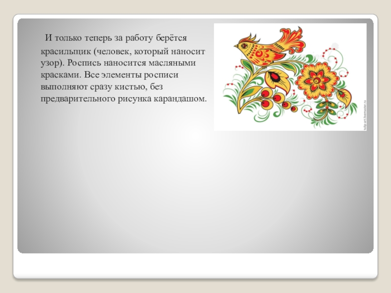 наносит узор). Роспись наносится масляными красками. Все элементы росписи выполняют сразу кистью, без предварительного рисунка карандашом.