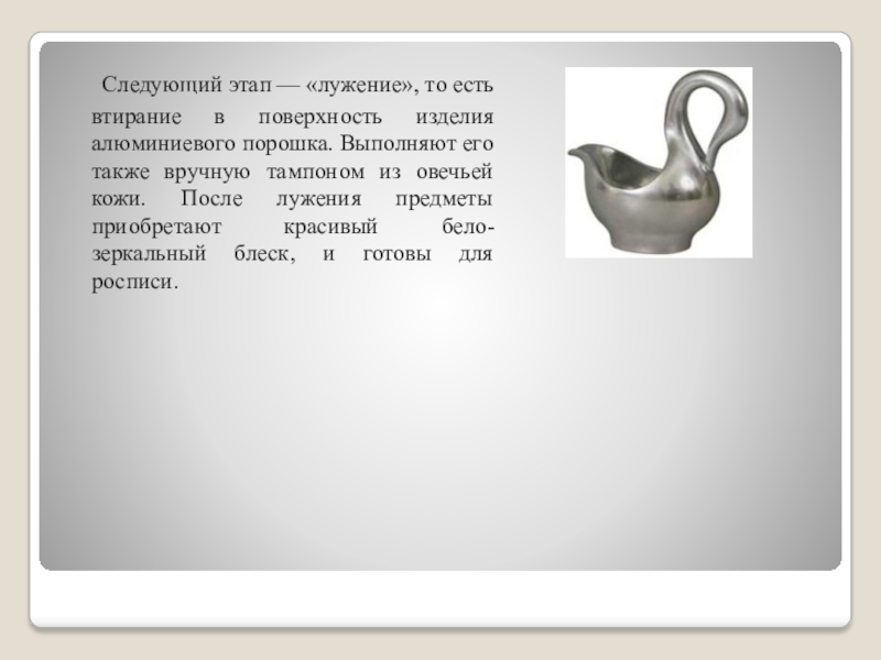 порошка. Выполняют его также вручную тампоном из овечьей кожи. После лужения предметы приобретают красивый бело-зеркальный блеск, и готовы для росписи.