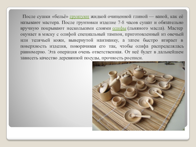 называют мастера. После грунтовки изделие 7-8 часов сушат и обязательно вручную покрывают несколькими слоями олифы (льняного масла). Мастер окунает в миску с олифой специальный тампон, приготовленный из овечьей или телячьей кожи, вывернутой наизнанку, а затем быстро втирает в поверхность изделия, поворачивая его так, чтобы олифа распределялась равномерно. Эта операция очень ответственная. От неё будет в дальнейшем зависеть качество деревянной посуды, прочность росписи.