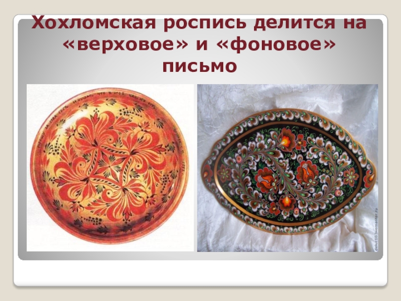 Слайд 10 Хохломская роспись делится на «верховое» и «фоновое» письмо