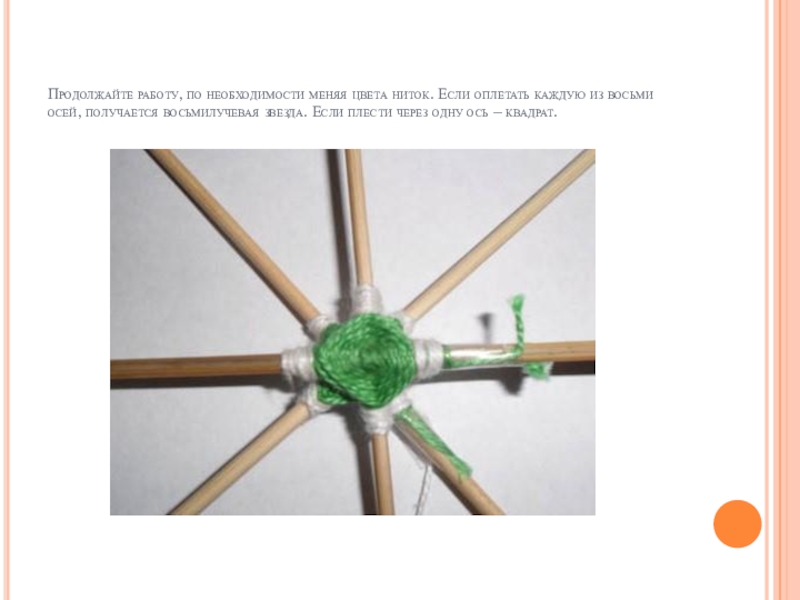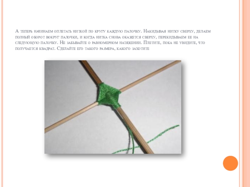 Слайд 7А теперь начинаем оплетать ниткой по кругу каждую палочку. Накидывая нитку