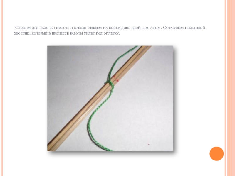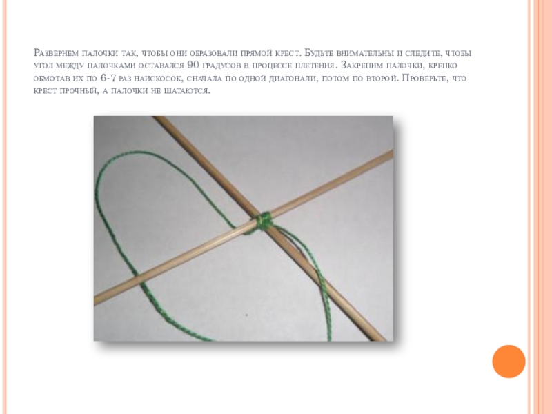 Слайд 5 Сложим две палочки вместе и крепко свяжем их посередине двойным