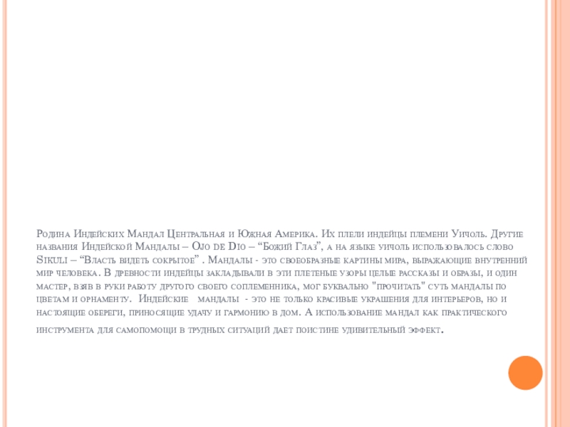 Уичоль. Другие названия Индейской Мандалы – Ojo de Dio – “Божий Глаз”, а на языке уичоль использовалось слово Sikuli – “Власть видеть сокрытое” . Мандалы - это своеобразные картины мира, выражающие внутренний мир человека. В древности индейцы закладывали в эти плетеные узоры целые рассказы и образы, и один мастер, взяв в руки работу другого своего соплеменника, мог буквально "прочитать" суть мандалы по цветам и орнаменту. Индейские мандалы - это не только красивые украшения для интерьеров, но и настоящие обереги, приносящие удачу и гармонию в дом. А использование мандал как практического инструмента для самопомощи в трудных ситуаций дает поистине удивительный эффект.