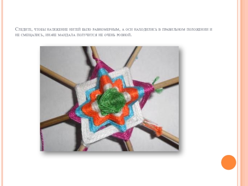 Слайд 11Следите, чтобы натяжение нитей было равномерным, а оси находились в правильном