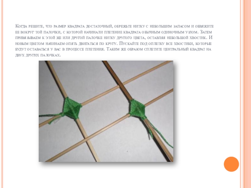 Слайд 8Когда решите, что размер квадрата достаточный, обрежьте нитку с небольшим запасом