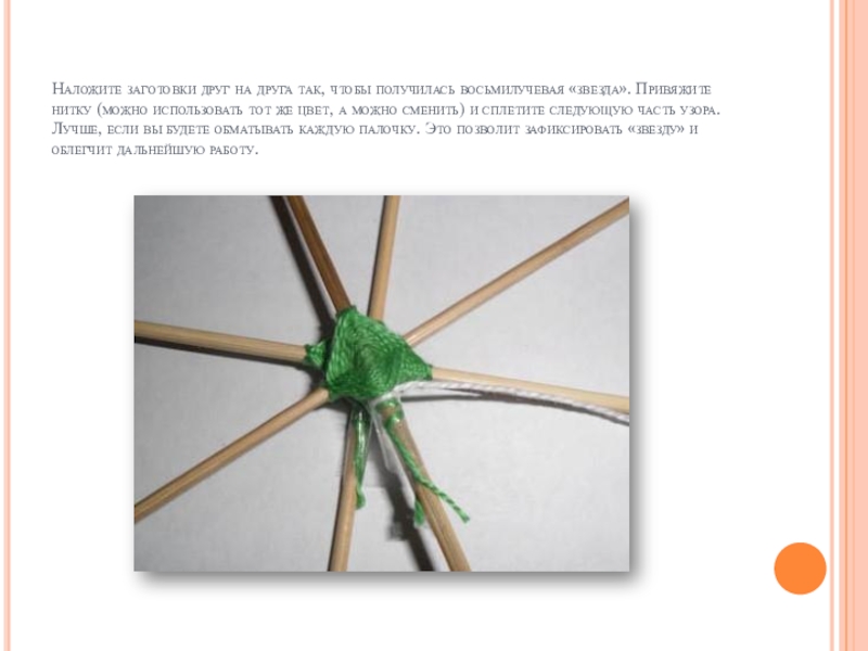 Слайд 9Наложите заготовки друг на друга так, чтобы получилась восьмилучевая «звезда». Привяжите