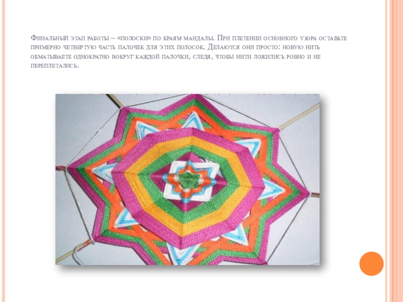 Слайд 13Финальный этап работы – «полоски» по краям мандалы. При плетении основного
