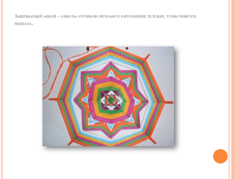 Слайд 14Завершающий аккорд – обмотка «лучиков» нитками и изготовление петельки, чтобы повесить