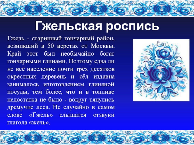 Москвы. Край этот был необычайно богат гончарными глинами. Поэтому едва ли не всё население почти трёх десятков окрестных деревень и сёл издавна занималось изготовлением глиняной посуды, тем более, что и в топливе недостатка не было - вокруг тянулись дремучие леса. Не случайно в самом слове «Гжель» слышатся отзвуки глагола «жечь».
