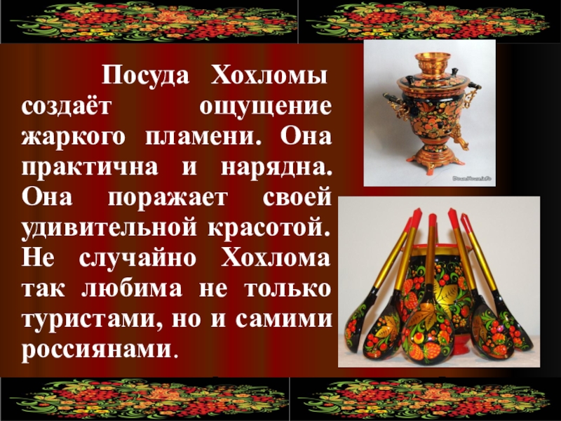 Слайд 3 Посуда Хохломы создаёт ощущение жаркого пламени. Она практична и