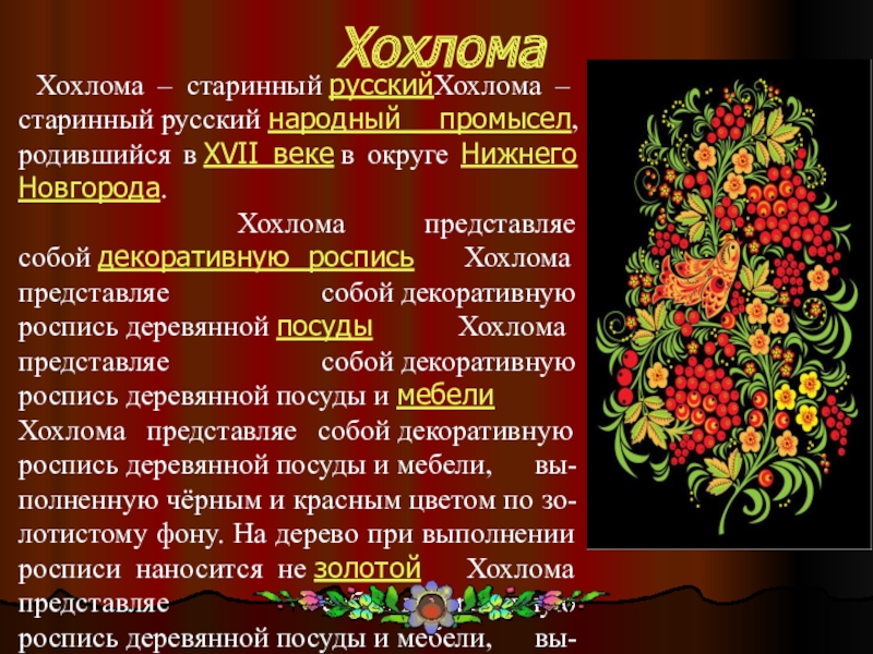 Хохлома – старинный русскийХохлома – старинный русский народный промысел, родившийся в XVII веке в округе